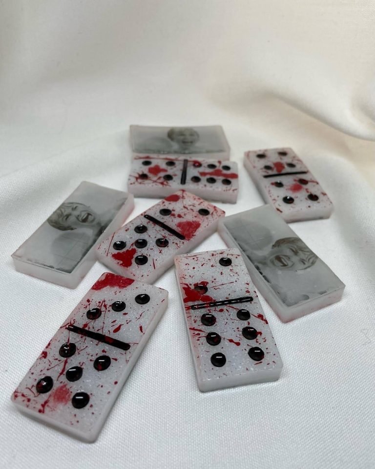 Ditch the traditional white tiles for something with a little more... bite. These custom-cast resin dominoes are hand-poured and finished with a 'blood splatter' effect. Each set is unique, durable, and perfect for horror enthusiasts who want to bring a touch of the macabre to their favorite tabletop games.
